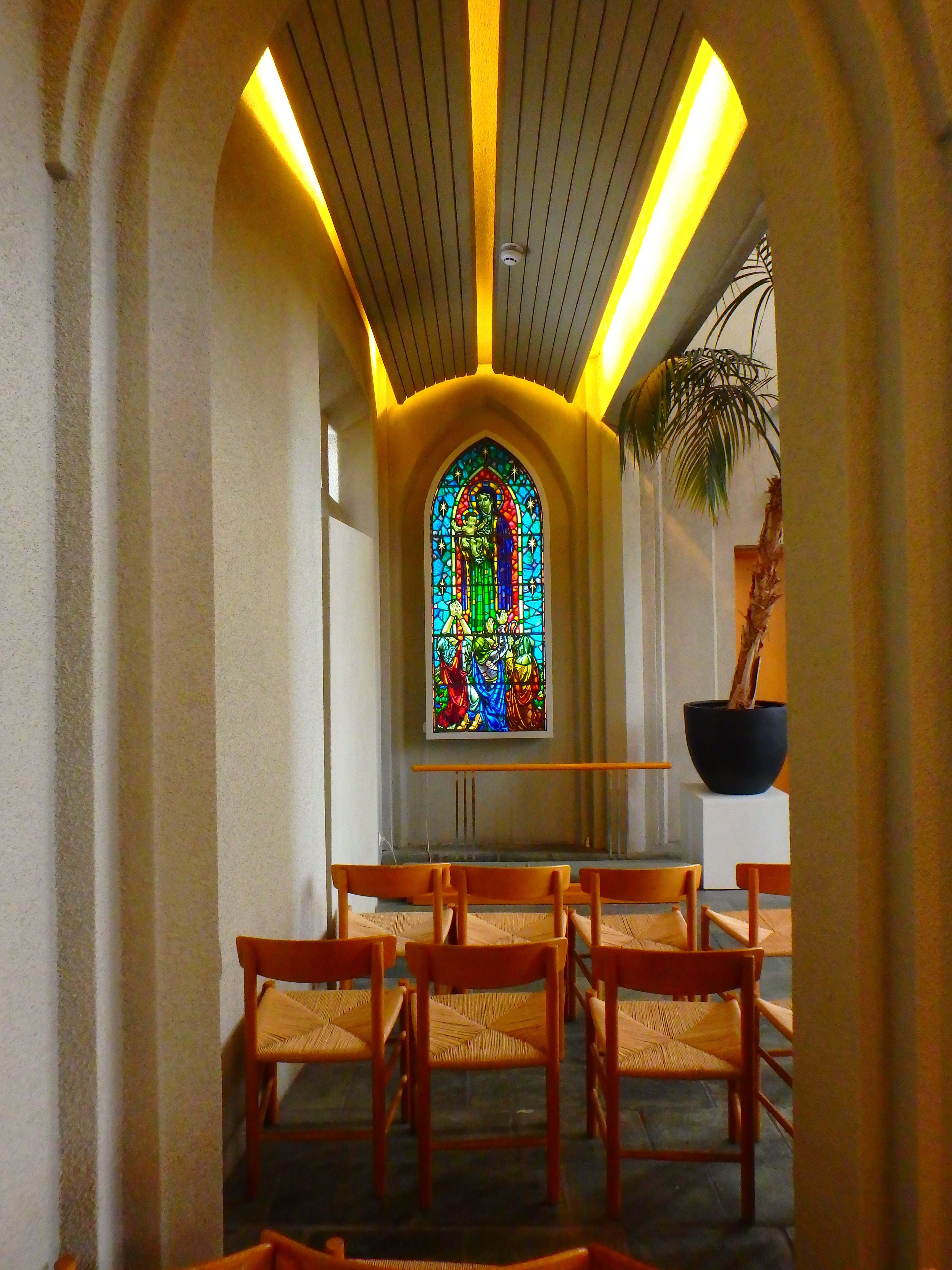 The white interior is punctuated with bright stained glass windows